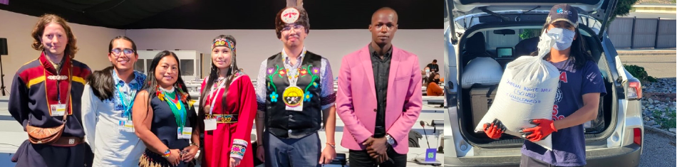Pictured: Chris Honahnie with other Indigenous youth knowledge holders at UNFCCC COP 26 in Glasgow Scotland, November 2021; Chris delivering wheatberries to Diné families in New Mexico during the COVID-19 pandemic in 2020.
